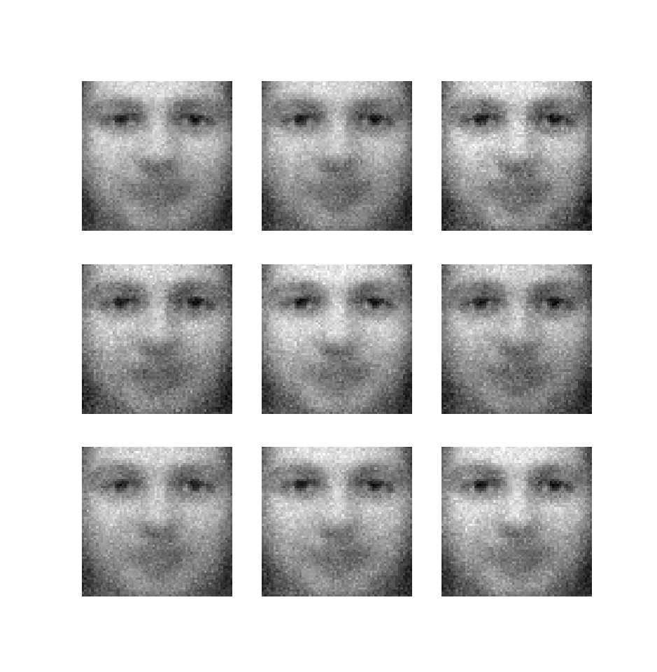 As you can see, the results are too noisy and the generated faces are too similar. This is because We’re not using the proper loss function. The last cell must output a figure similar to this one: